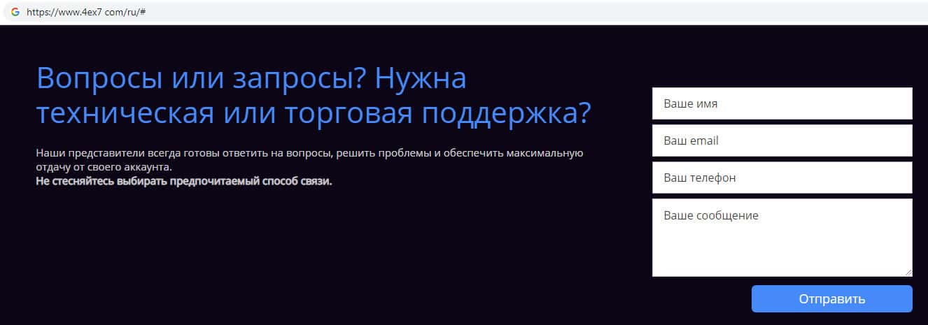 - Техническая поддержка на сайте мошеннической организации 4EX7