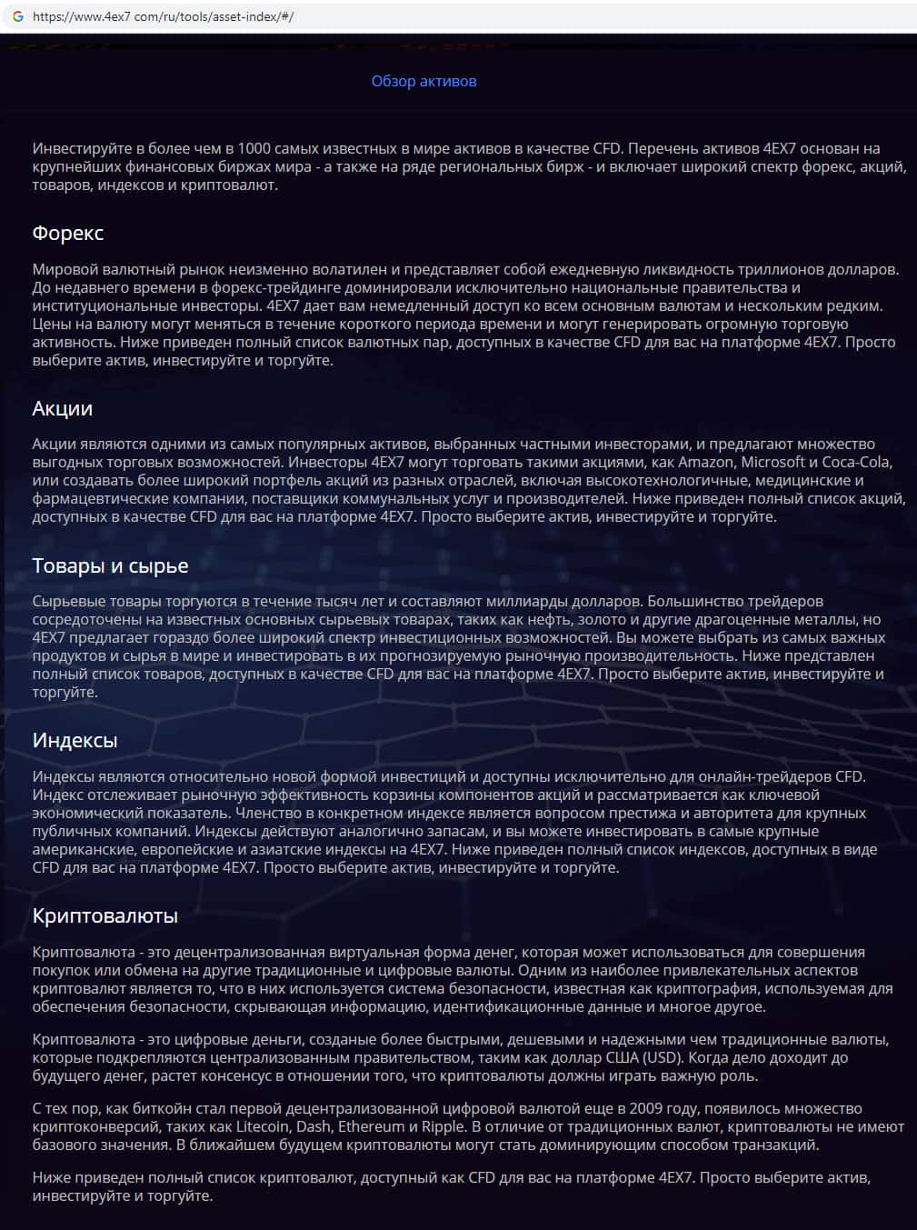Здесь жулики 4EX7 дают возможность пользователям сайта ознакомиться с перечнем финансовых инструментов, с которыми якобы специалисты будут совершать сделки и зарабатывать Вам деньги. Верить в такого рода сказки скам-компании 4ИИкс7 нельзя, поскольку похожая информация очень часто встречается на сайтах подобных скам-проектов.