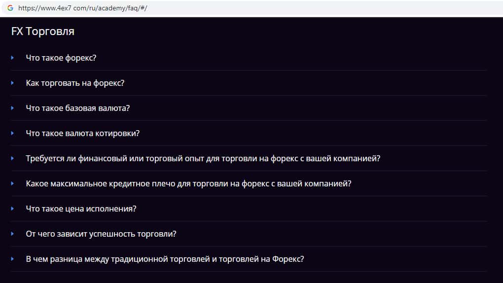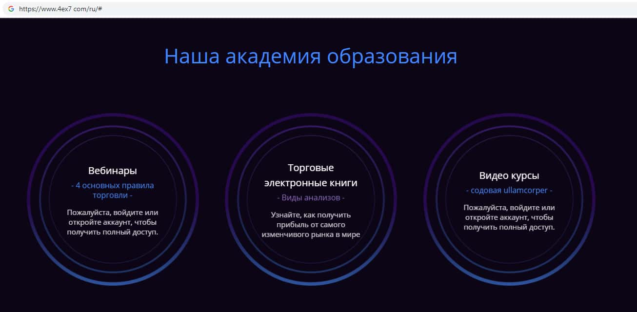 Здесь мошенники 4EX7 рассказывают сказки о том, что они якобы занимаются обучающей деятельностью, а именно обучением псевдо-науке, трейдингу. Единственное чему действительно можно обучиться на сайте скам-брокера 4ИИкс7 - это больше не связываться с подобными жульническими конторами.