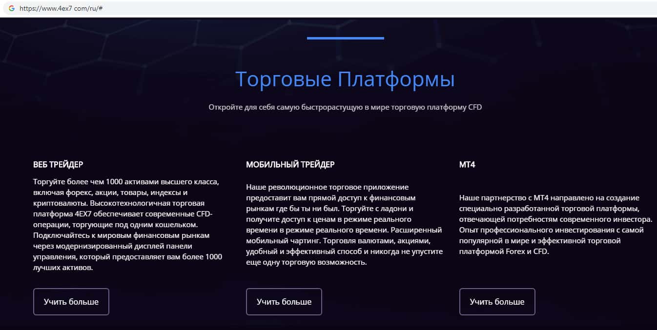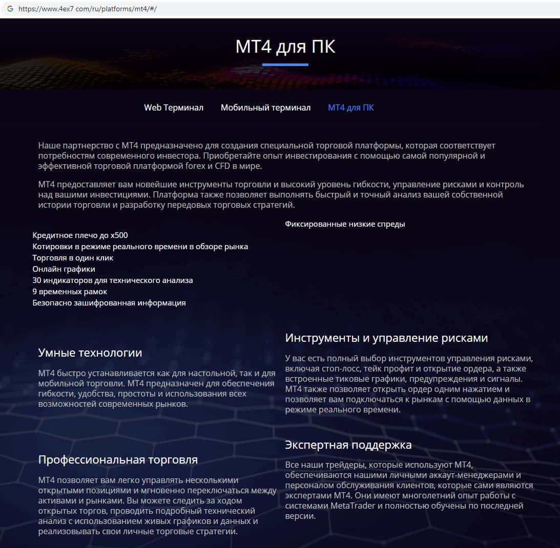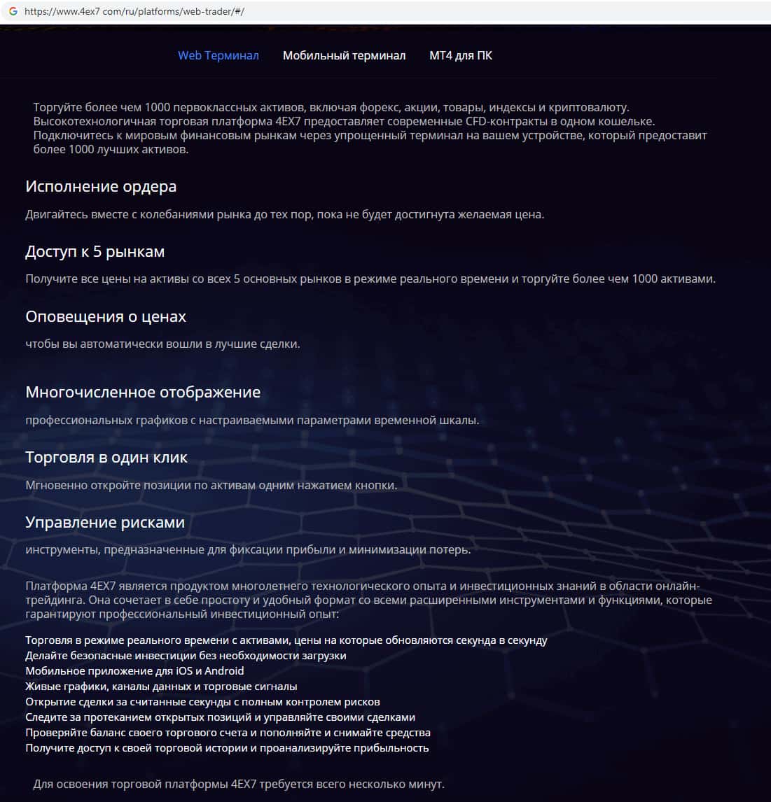Мошенники 4EX7 расхваливают свой сайт как можно больше предлагая пользователям начать торговать на их сайте. Здесь аферисты вешают людям лапшу на уши, что их торговая платформа понятная и удобная, что она разработана как для компьютеров так и для мобильных устройств. Это шулера 4ИИкс7 называют удобством пользования платформой.