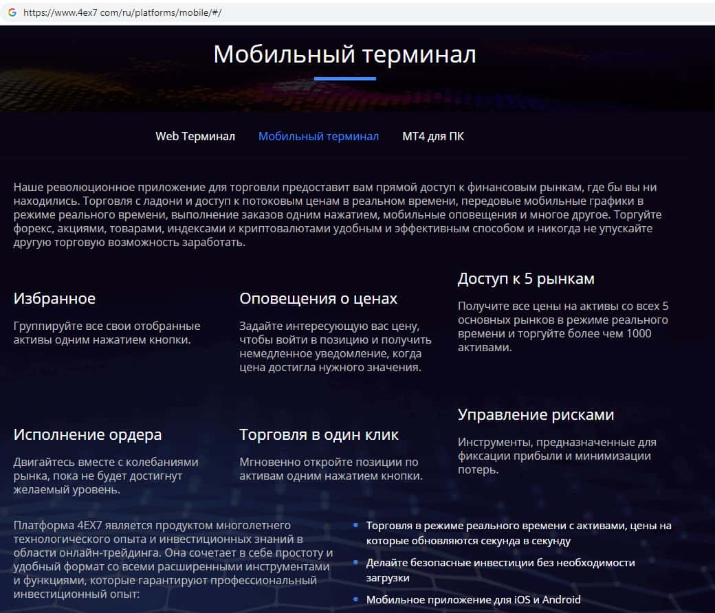 Мошенники 4ИИкс7 предлагают пользователю скачать приложение с торговой платформой сайта на смартфон. На самом деле это делается для того, чтобы подсадить клиента на крючок. Ни в коем случае не скачивайте приложения с торговой платформой 4EX7, потому что это лохотрон и очередной обман !!!