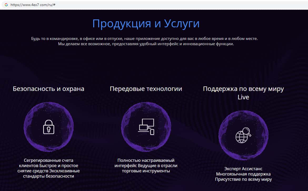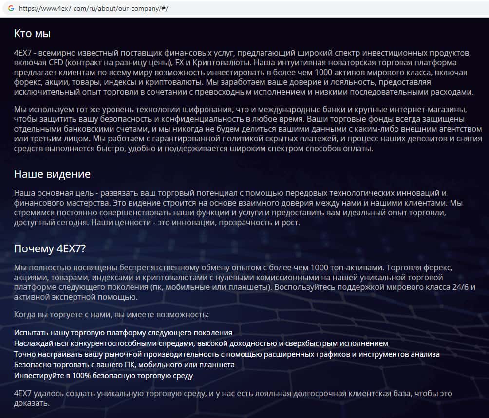 Аферисты 4ИИкс7 на своем фальшивом сайте опубликовывают совершенно не правдивую информацию, которая не имеет никакого отношения к реальной деятельности скам-компании. Имеется ввиду тот факт, что шулера 4EX7 не имеют никакого отношения к международному финансовому рынку.
