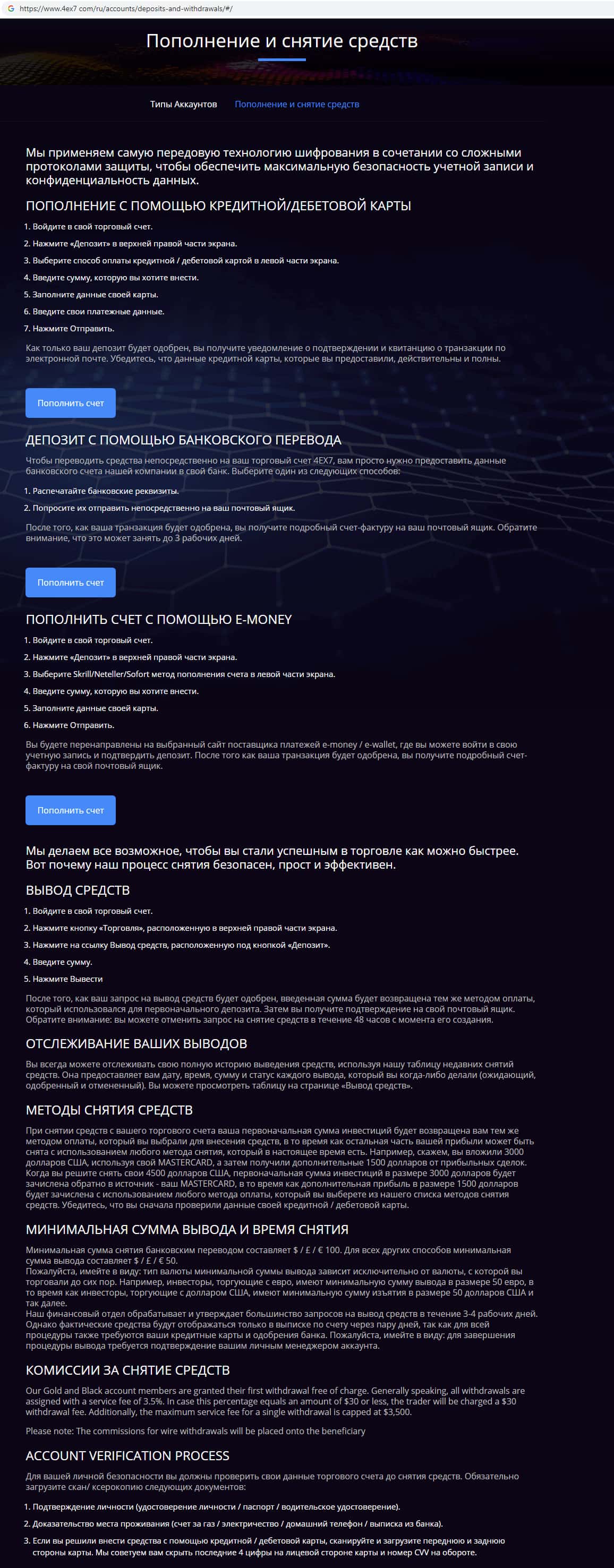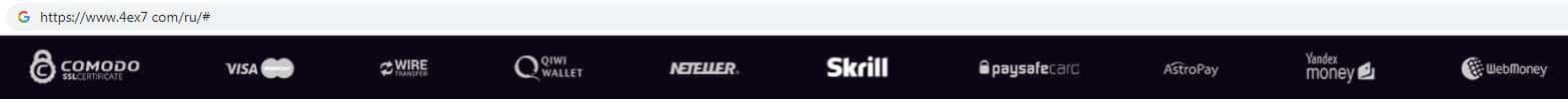Для перевода денежных средств аферисты 4EX7 предоставляют на своем официальном сайте перечень платежных систем, якобы предоставляя выбор клиенту каким способом можно пополнить торговый счет. Связавшись со скам-брокером 4ИИкс7 Вы должны понимать, что подобные организации зачастую не возвращают деньги людям.