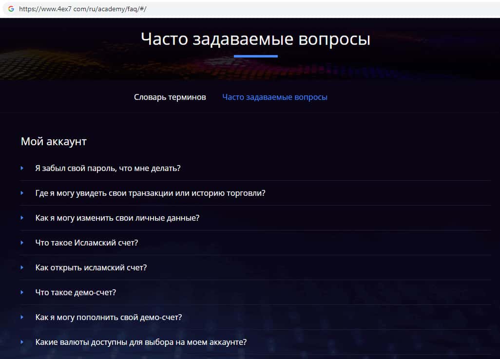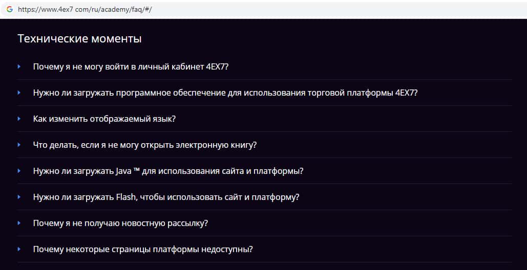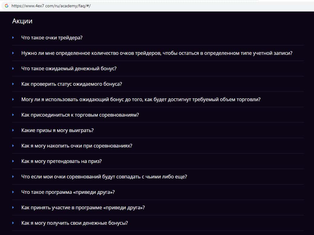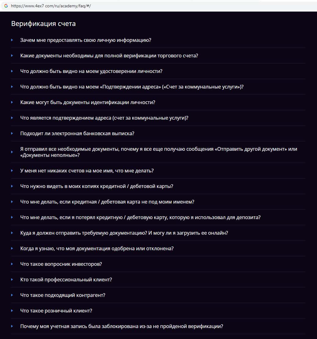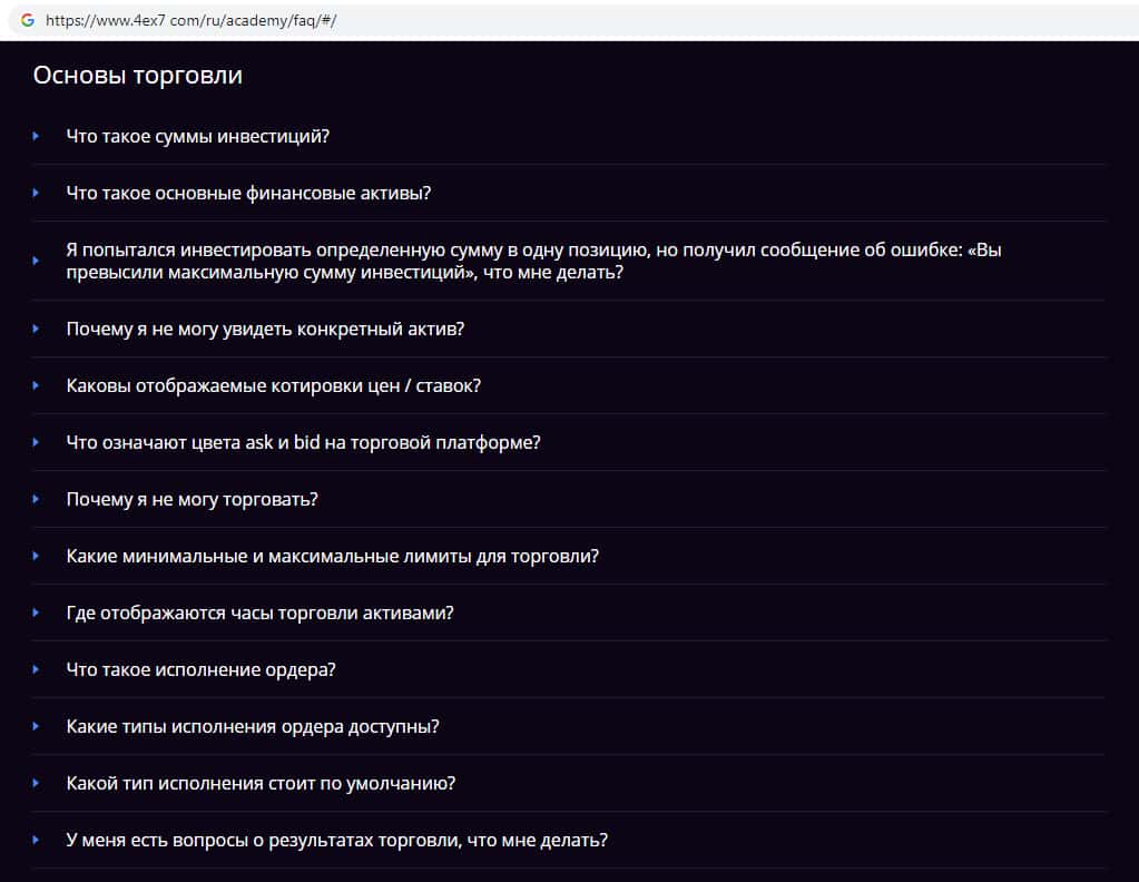 На официальном сайте жуликов 4ИИкс7 были замечены уже продуманные всевозможные ответы на те вопросы, которые могут задавать клиенты, например в случае неудачной сделки или же каких либо проблем связанных с работой на сайте. Не обнаружено ни одного конкретного ответа какой-либо вопрос.