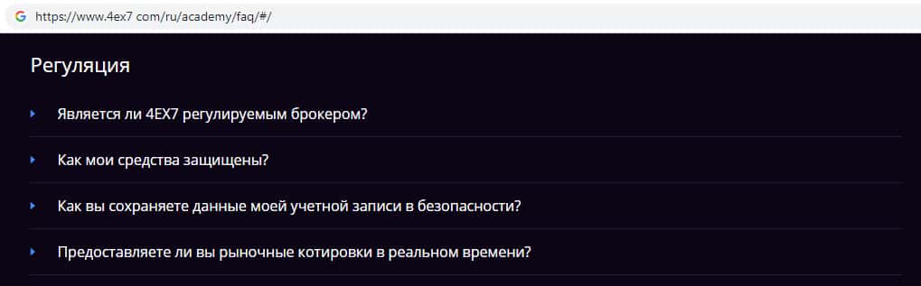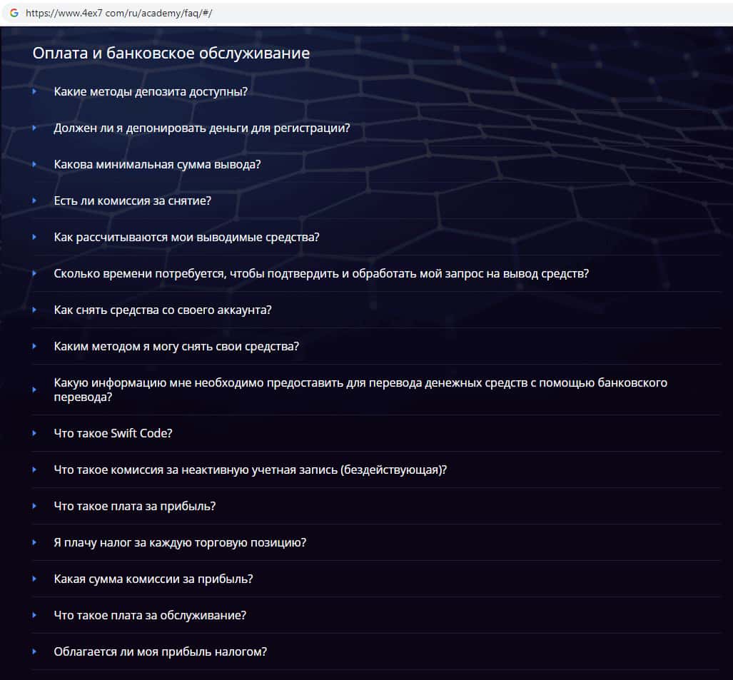 В случае возникновения каких-либо проблем связанных с выводом денежных средств, мошенники 4ИИкс7 всегда будут ссылаться на предлагаемые ответы. Шулера 4EX7 аргументируют это тем, что ответы на Ваши вопросы уже прописаны и у них нет такой возможности более подробно отвечать.