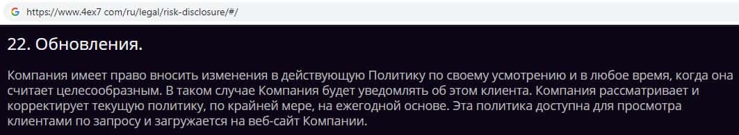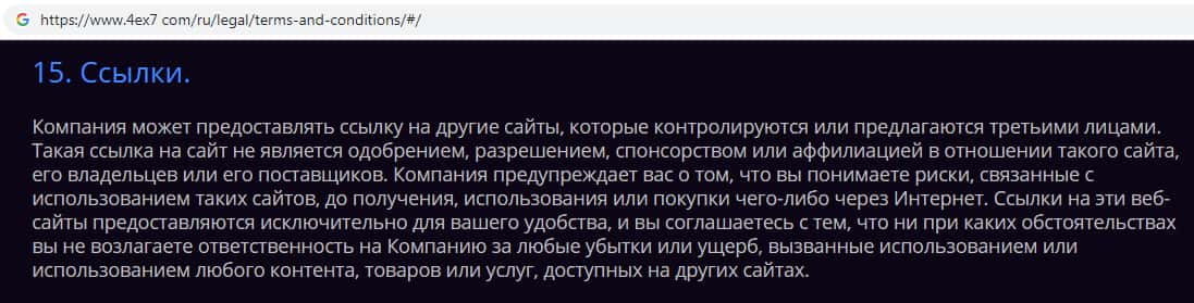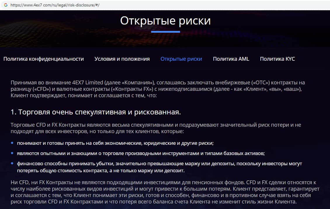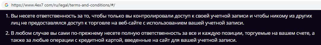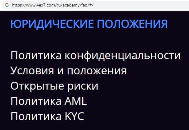 Жулики 4EX7 на своем дырявом сайте предлагают ознакомиться с условиями использования сайта, политикой конфиденциальности, о борьбе с отмыванием средств, информацией о возврате денежных средств, а так же с информацией о всевозможных рисках. Не один из предоставленных документов 4ИИкс7 не имеет юридической силы.