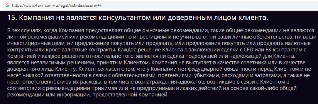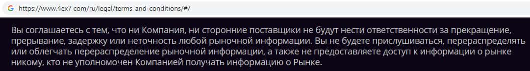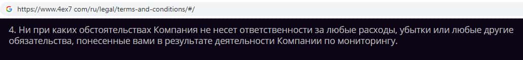 Важным моментом в клиентском соглашении скам-компании 4ИИкс7 является то, что представители данной конторы могут давать любые рекомендации по поводу торговли на сайте, но ответственности они за это не будут нести никакой. Поэтому не рекомендуем связываться с данной брокерской конторой 4EX7 !!!