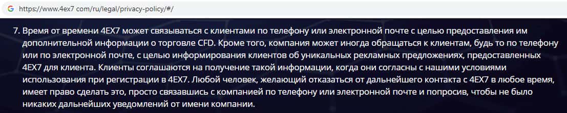 Политика конфиденциальности на интернет-портале мошеннической организации 4EX7