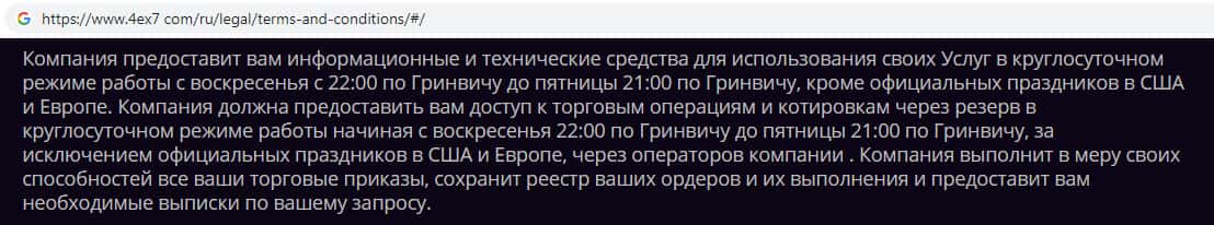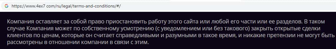 По словам жуликов 4EX7 их дырявый сайт может в любой удобный им момент попросту прекратить свое существование или же временно перестать работать. Из этого следует вывод о том, что компания 4ИИкс7 не надежная и сайт может в любое время соскамиться. Доверять свои денежные средства такого рода конторам нельзя !!!