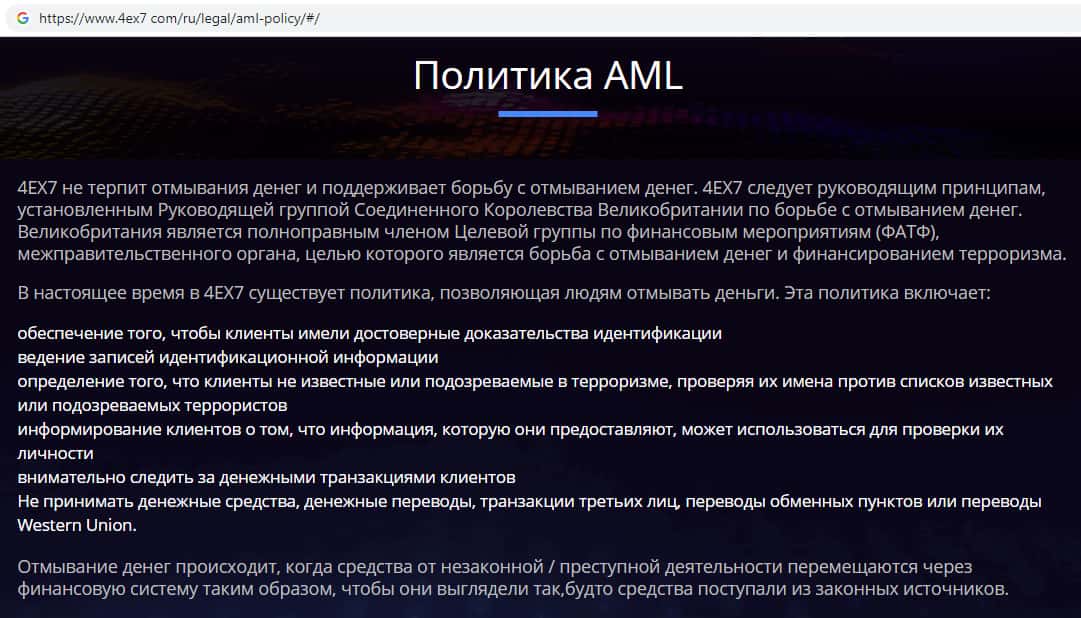 Жулики 4ИИкс7 пытаются создать видимость того, что ведут борьбу с отмыванием денежных средств. Данный документ, именно в таком виде как предоставили аферисты 4EX7, имеется у каждой мошеннической конторы, которая пытается доказать честность и надежность предоставления услуг своей компании.
