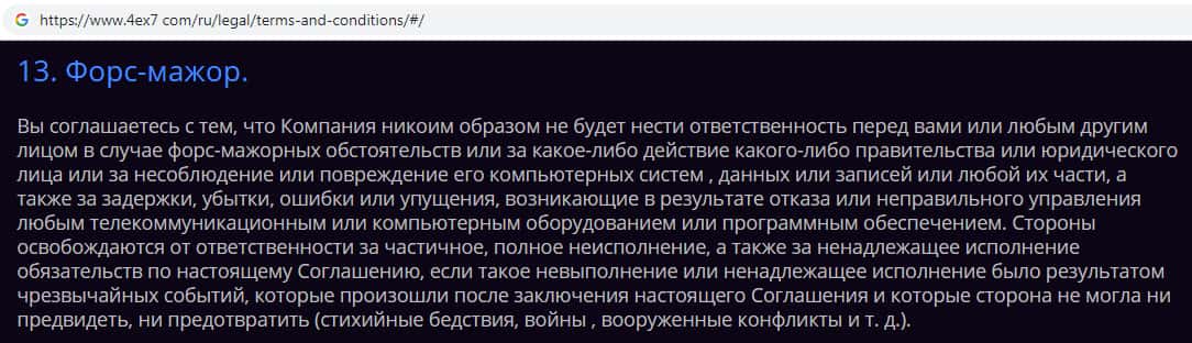 Шулера 4EX7 не несут никакой ответственности за какие-либо убытки клиента, включая то, что на их дырявом сайте невозможно вернуть свои вложенные денежные средства, и конечно же обещанную прибыль. Задумайтесь, прежде чем принимать такое решение регистрироваться на сайте скам-брокера 4ИИкс7 !!!