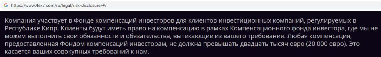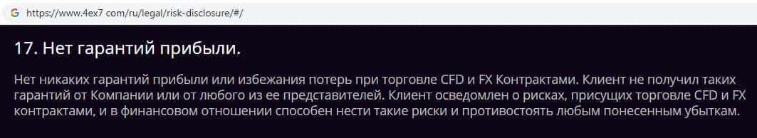 В уведомлении о рисках мошенническая организация 4EX7 указывает о том, что торговля на сайте сопряжена определенным уровнем риска. Соответственно данная брокерская компания не несет никакой ответственности за деньги утраченные клиентом на их фальшивом сайте. В данном случае шулера ссылаются на ошибочный выбор торговой стратегии клиента.