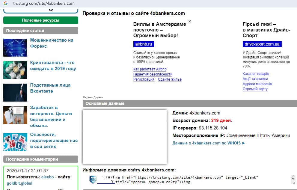 Согласно данным с уважаемого веб-портала trustorg com, возраст домена интернет-страницы аферного форекс дилера 4х Банкерс составляет всего 219 дней, а располагается в США, что моментально обозначает , что информация канула в лету. Также невозможно проследить абсолютно ничего о сайте слившегося брокера: у него нет даже оценок в системе.