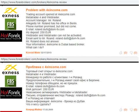 Один клиент описал свою ситуацию, в которой он попался на удочку шулеров 4xIncome. Жулик, а именно в этом случае был задействован некий Роланд, который работал менеджером, вытянул 250 евро со счета клиента и теперь он не выходит на связь. Теперь осталась только почта, на которую он не отвечает: roland.dutti@dom-fx com