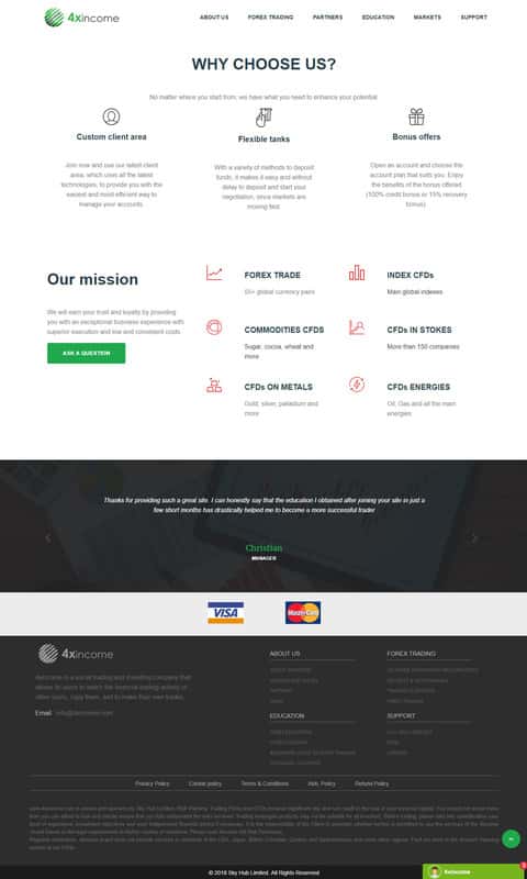 Вторая часть сайта подразумевает описание преимуществ торговли с шулерами 4х ИнКом. Аферисты рассказывают о различных торговых инструментах для торговли, хотя не указывают, что все эти инструменты липовые и реального доступ к торговли ими они не дают. Ну и напоследок несколько выдуманных отзывов от якобы сотрудников 4x Income.