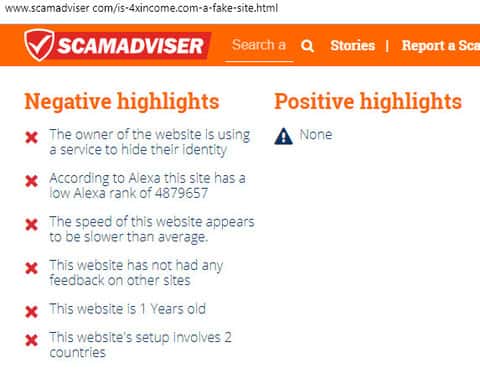 А вот еще какую информацию вскрывает нам о сайте кухни 4xIncome ресурс scamadviser com где он по статистике попал сразу в 6 спам-фильтров. То есть получается что его отвергают нормальные поисковики и понятное дело чем вообще занимается эта гнусная контора. Не зря на нее пишут негативные отзывы.
