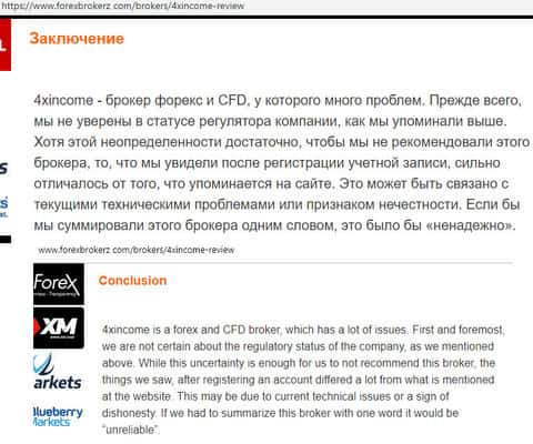 Как заявляет интернет-сайт forexbrkerz com, контора 4xIncome - это черный брокер у которого много проблем. Прежде всего стоит отметить, что у нее нет статуса регулированой конторы, а также информация, которая появляется после регистрации аккаунта, сильно отличается от той которая находится просто на сайте.