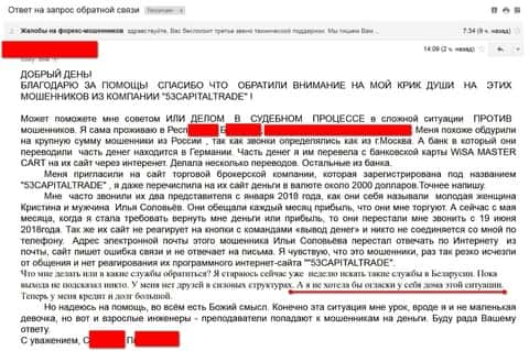 Очередное обращение от жертвы лохотронщиков 53 Капитал Трейд пришло к нам в редакцию. Человек просит помощи вернуть сворованное мошенниками, так как это его последние деньги и, отдав их, он понял что просто повелся у них на поводу и под их влиянием сделал огромную ошибку жизни. Шарлатаны, не задумываясь ни о чем, слили его депозит, а на звонки жертвы они не отвечали и на письма, кстати, тоже.