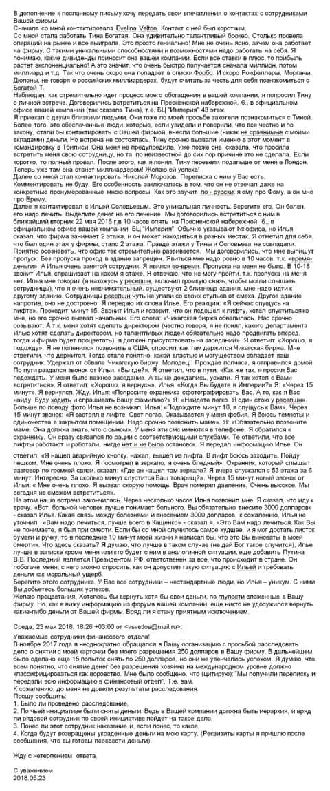 Лохотронщики 53 Capital Trade продолжают облапошивать людей на деньги. Человеку позвонили из этой грязной брокерской конторы и по-старинке начали пудрить мозги и вымогать деньги. Общение с будущей жертвой начала Evelina Velton, которая занималась первоначальной обработкой. Далее передали клиента в руки Тины Богатой, которая занималась торговлей и, по словам жертвы, достаточно успешно. Потом на восхищение работы Тины, клиент захотел встретиться с ней и захотел привести с собой еще 2 заинтересованных коллеги, которые были при деньгах. Но Тину вдруг вызывают в командировку в Тбилиси и назначенная встреча срывается. После этой ситуации жертву развода отдали на обработку к Николаю Морозову, который размыто отвечает на вопросы и дальше работа продолжалась уже с одним больным человеком, работающий в 53 Капитал Трейд Ильей Соловьевым. Клиент желал встретиться с ним в их официальном офисе, но началась непонятная история с офисами и зданиями, где Илья морозился как только мог: И Чикагская биржа обвалилась и срочно к директору нужно, и прочие отмазки. Потом он перезвонил и спросил где клиент и почему он его не дождался, на что жертва развода вернулся и Илья начал его искать. Потом сломался лифт и Илья перепугался, хотя на самом деле все работало. Короче, все шло как в лучших комедиях мирового кино. В итоге он просто попросил его внести 3000 долларов, но куда и зачем не объяснил. В итоге жертва обмана пытался вывести свои 250 долларов, но у него не вышло.