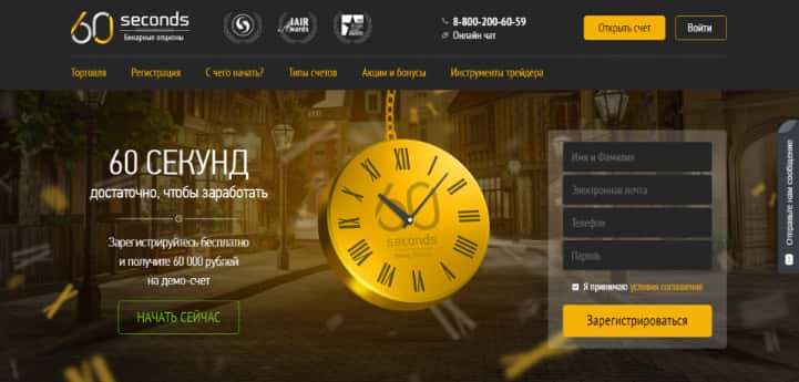До того, как руководство липового биржевого брокера 60 seconds приняло решение смыться подальше от обманутых пользователей и правоохранительных органов, припрятать все награбленные денежные средства в офшорную зону, их официальный интернет-портал выглядел так, как на нижеуказанном скриншоте.