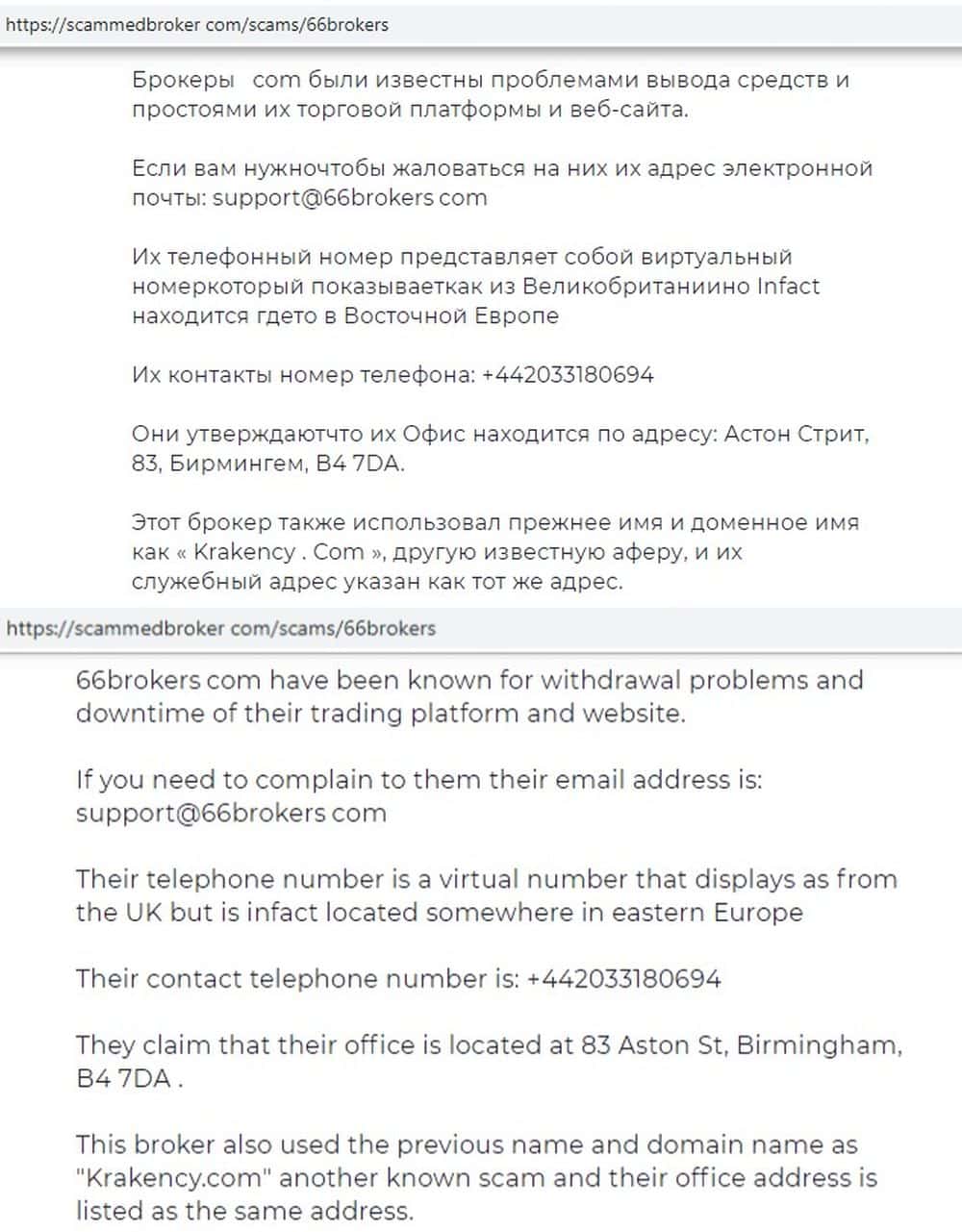 Мошенники 66Brokers сделали все возможное, чтобы стереть о себе информацию в сети. Это не удивительно, так как кидалы сменили шкурку и продолжают работать под другим именем, Krakency. Это легко проследить, так как лохотронщики 66Brokers оставили номер телефона и адрес без изменения. Контакты кидал: