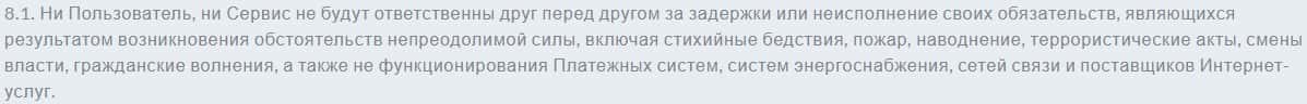 Ниже также указано, что контора 7 Мани не несет ответственности перед клиентами за неисполнение обязательств, если посчитают что случились форс-мажорные обстоятельства.