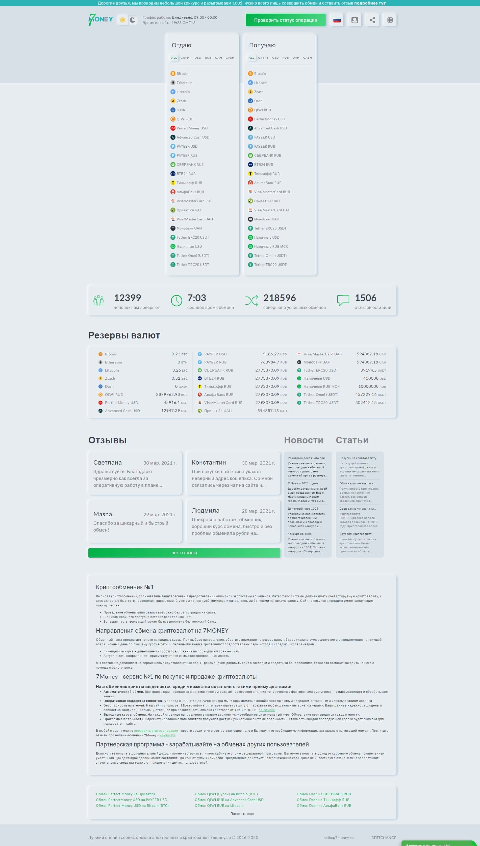 Ниже вы можете ознакомиться с главной страницей официального интернет-сайта обменки мошенников 7 Мани, который помогает им привлекать и обворовывать наивную аудиторию.