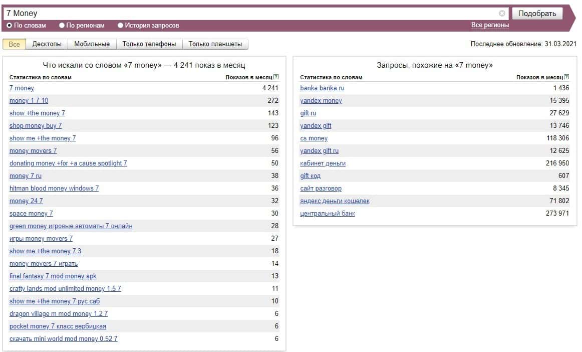 По поводу англоязычной версии бренда "7 Money" сказать есть что, так как результаты запросов намного увеличились и достигли 4241 показам в месяц.