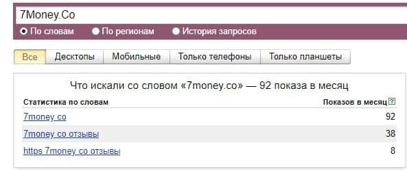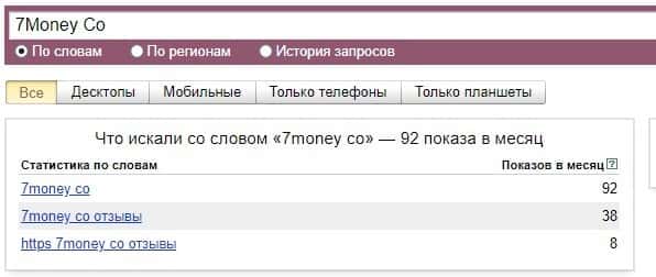 Бренд конторы "7 Мани" в Яндексе искался 1595 раз за последний месяц, поэтому данную контору можно считать очень опасной для русскоязычных пользователей.