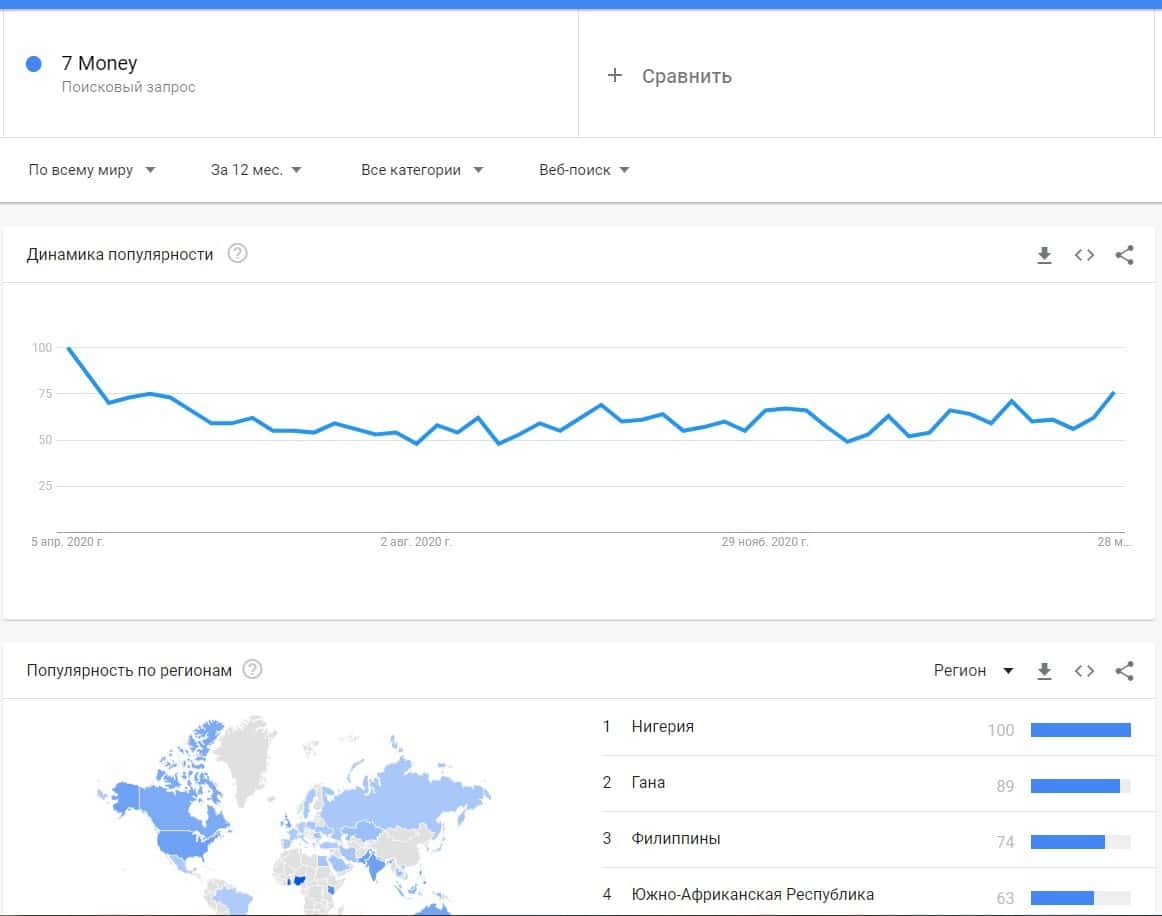 Бренд конторы "7 Money" имеет множество запросов в поисковой системе Гугл, и в основном они исходят с таких стран как: Нигерия, Гана, Филиппины и ЮАР.