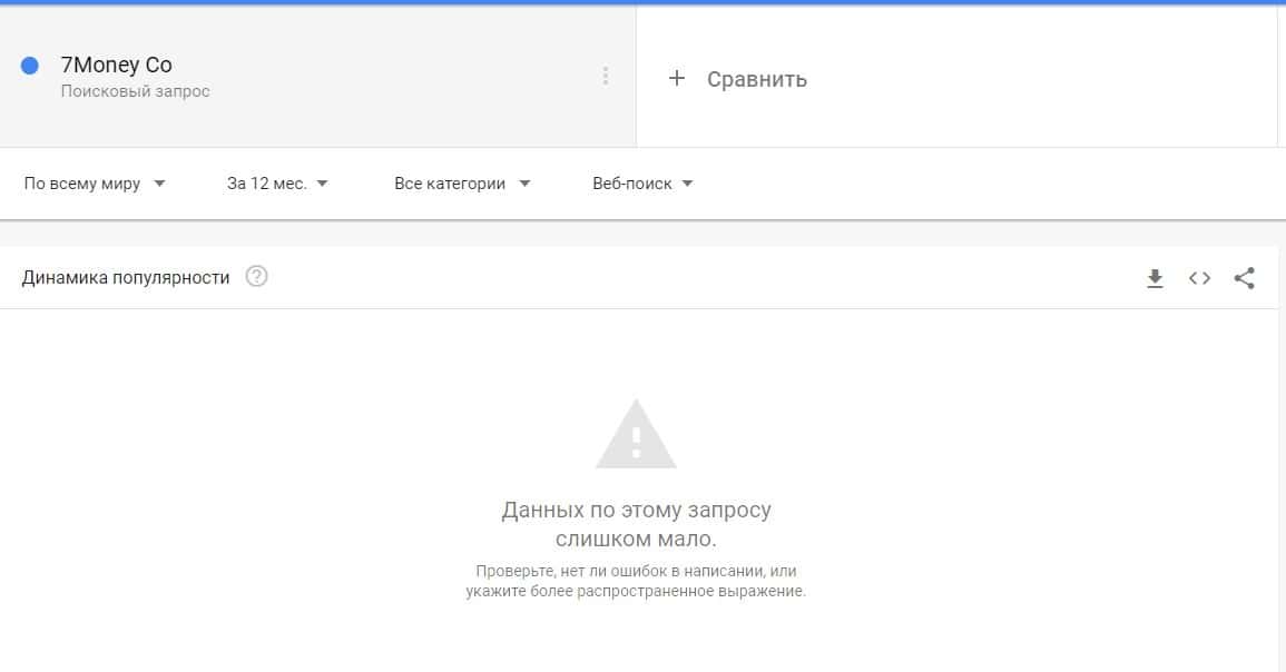 Ну и бренд самого сайта "7Money Co" в запросах по версии Гугл Тренд также ни разу не был отмечен и это означает о низких рейтингах конторы в поисковых системах.
