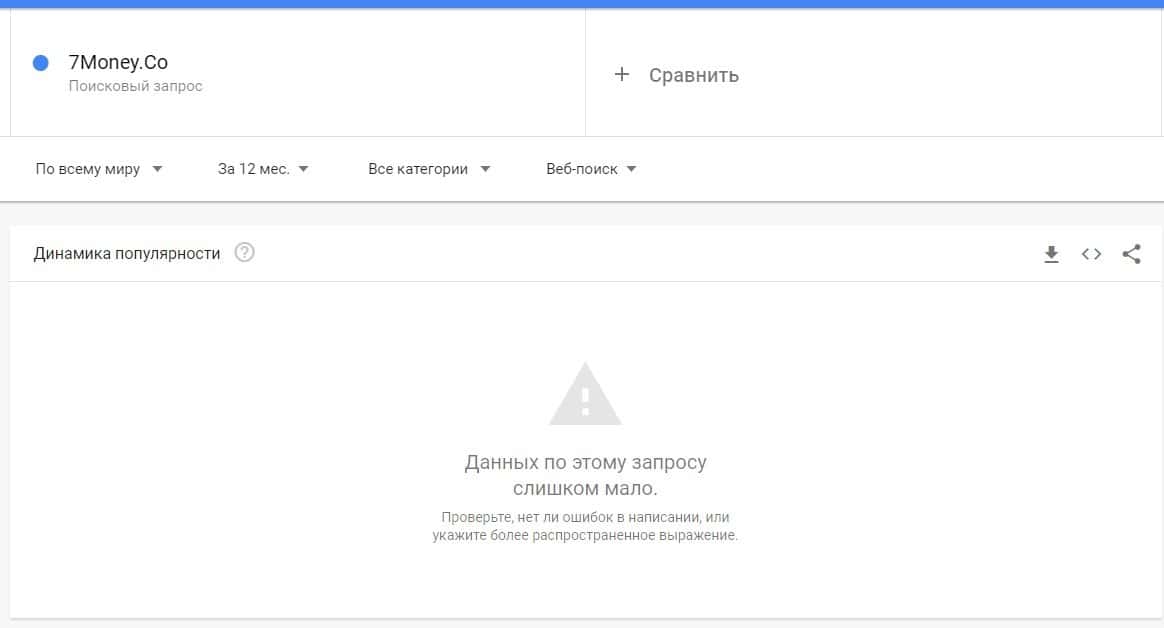 Бренд сайта "7Money.Co" все-таки не ищется в поисковой системе Гугл и не было совершено ни одного запроса по статистике системы Гугл Трендс.