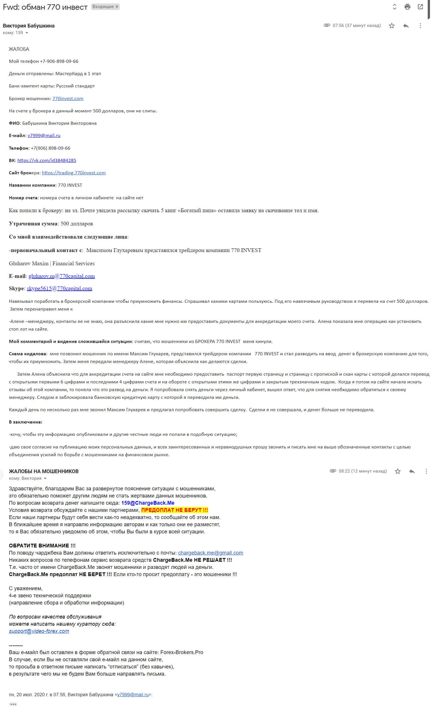 Жалоба на мошенников 770 Инвест и 770Капитал - клиент утратил 500$