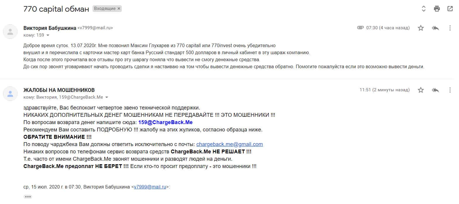 Спустя некоторое время, на емайл сайта разоблачающего деятельность мошенников, пришла подробная жалоба на аферистов 770Инвест, данным разводом на деньги занимался жулик Максим Глухарев, его емайл:
