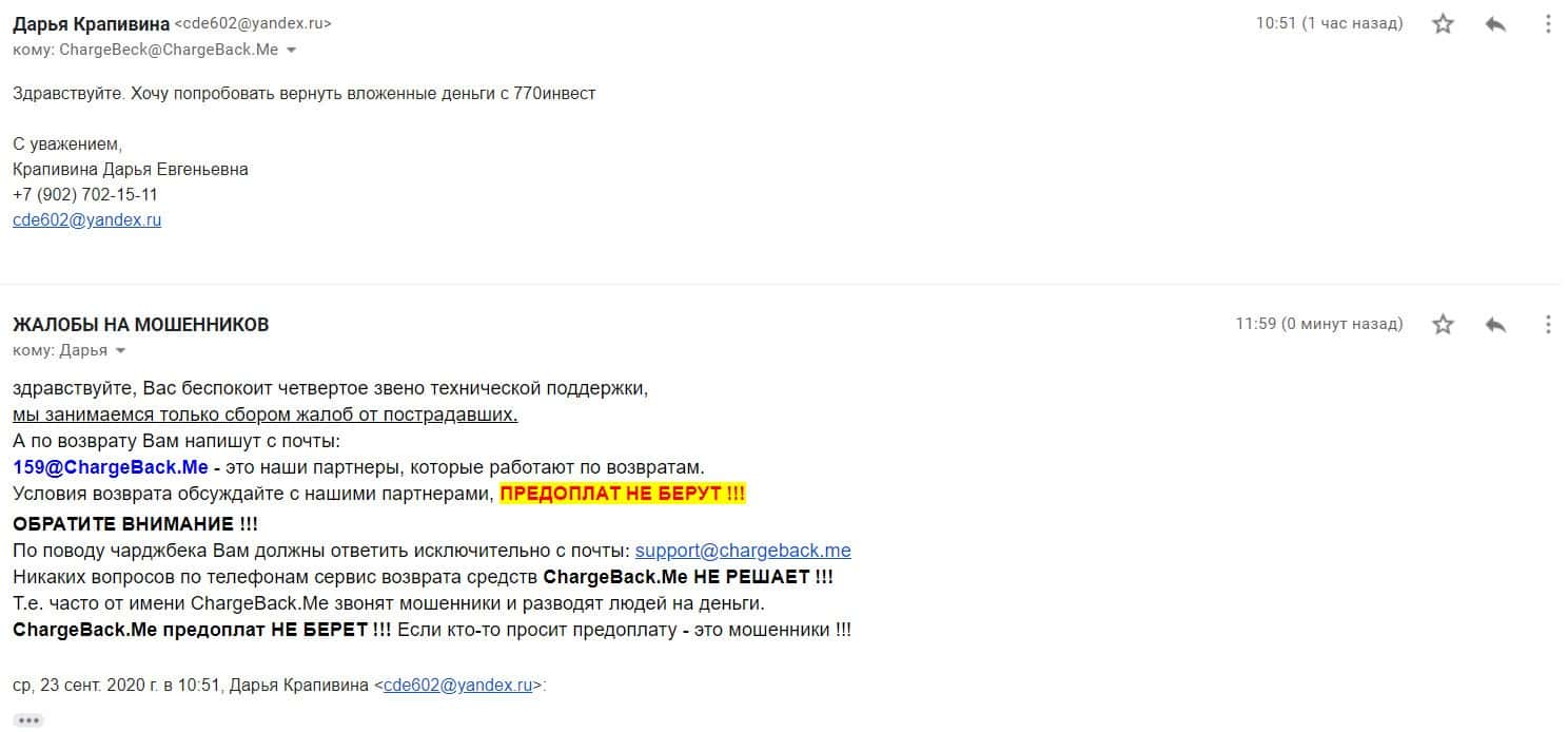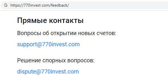 Лохотронщики 770 Инвест на своем официальном интернет-ресурсе указывают два адреса электронной почты, а именно: