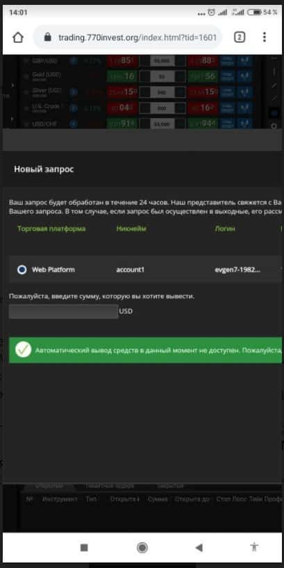 Очередной обманутый клиент жульнической форекс-организации 770 Инвест прислал жалобу, человек предоставил доказательство того, что он не может вывести деньги из этой кухни.