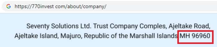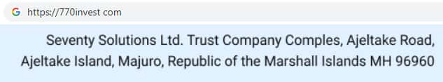 Контора 770Invest прячется в оффшоре, потому как предоставляет фальшивый регистрационный номер с регуляцией на Маршалловых Островах.
