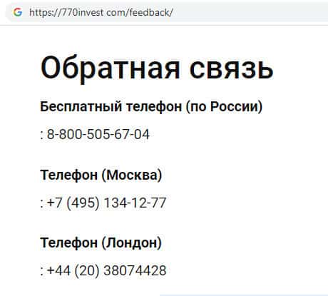Обманщики 770Invest на своем дырявом сайте указали целый список номеров контактного телефона, с которых навязчиво названивают потенциальным жертвам: