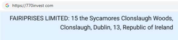 На сайте аферистов так же указано еще одно юридическое лицо Fairiprises Limited, которое управляет интернет-лохотроном 770 Инвест.