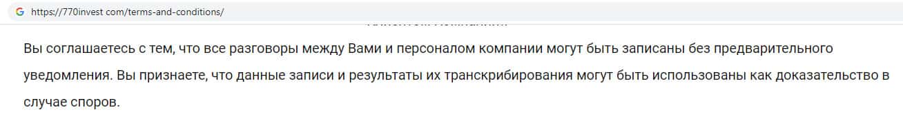 Без предварительного уведомления мошенники 770Invest записывают все телефонные звонки, поэтому внимательно читайте соглашение, прежде чем связываться с данной шарагой.