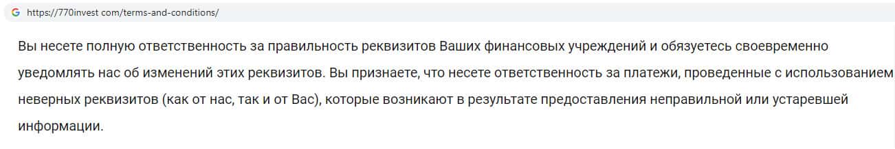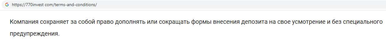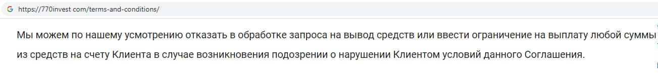 Контора 770 Инвест может в любой момент отклонить запрос на вывод денежных средств, если по их мнению какое-то из условий якобы не выполнено.