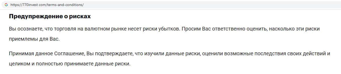 Аферисты 770Invest предупреждают о том, что торговля на их сайте сопряжена высоким уровнем риска потери средств, за что компания конечно же ответственности не несет.