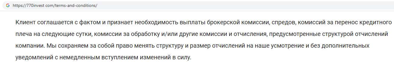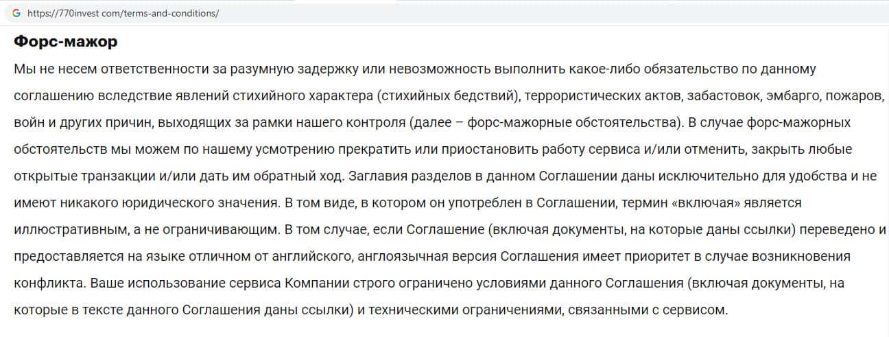 Ниже предоставлена полная версия пользовательского соглашения мошеннической организации 770Invest, которое подтверждает то, что перед нами очередная форекс кухня.
