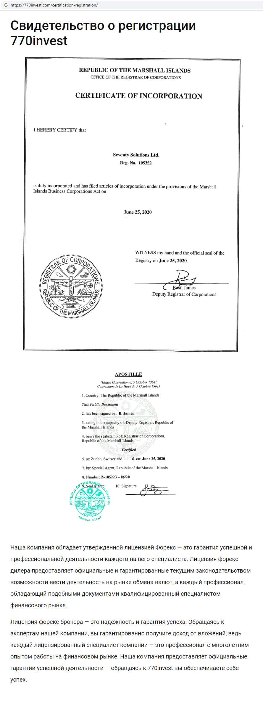 Вместо лицензии компании мошенники 770 Инвест на своем дырявом сайте предоставили сертификат о регистрации, который вероятнее всего им не принадлежит.