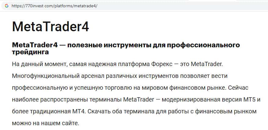 Жулики 770Invest предлагают торговать на торговой платформе Мета Трейдер 4, которое разработано компанией Мета Куес специально для слива денежных средств клиента.
