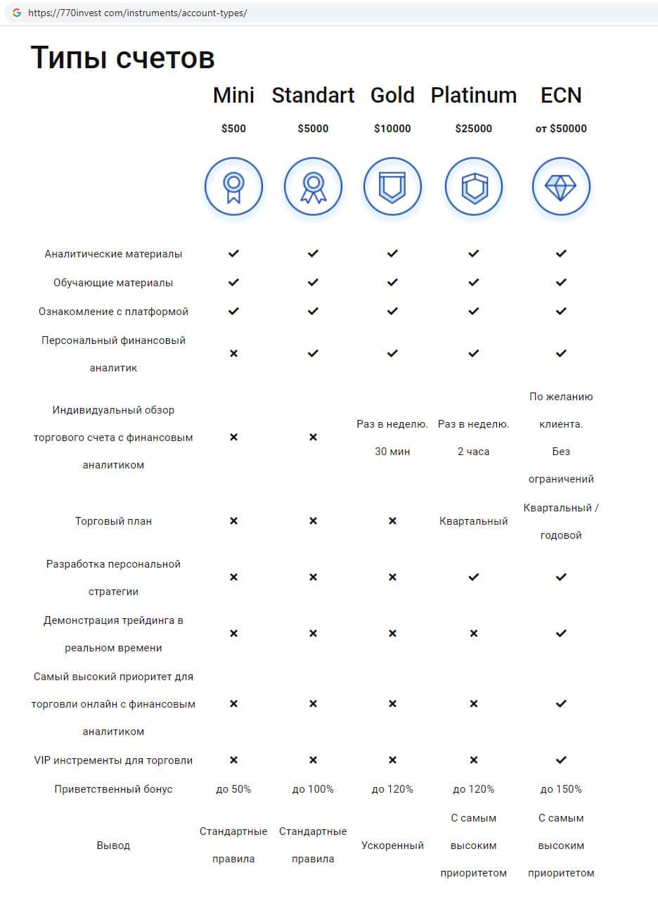 - Торговые счета предлагаемые на веб-сервисе конторы 770Invest