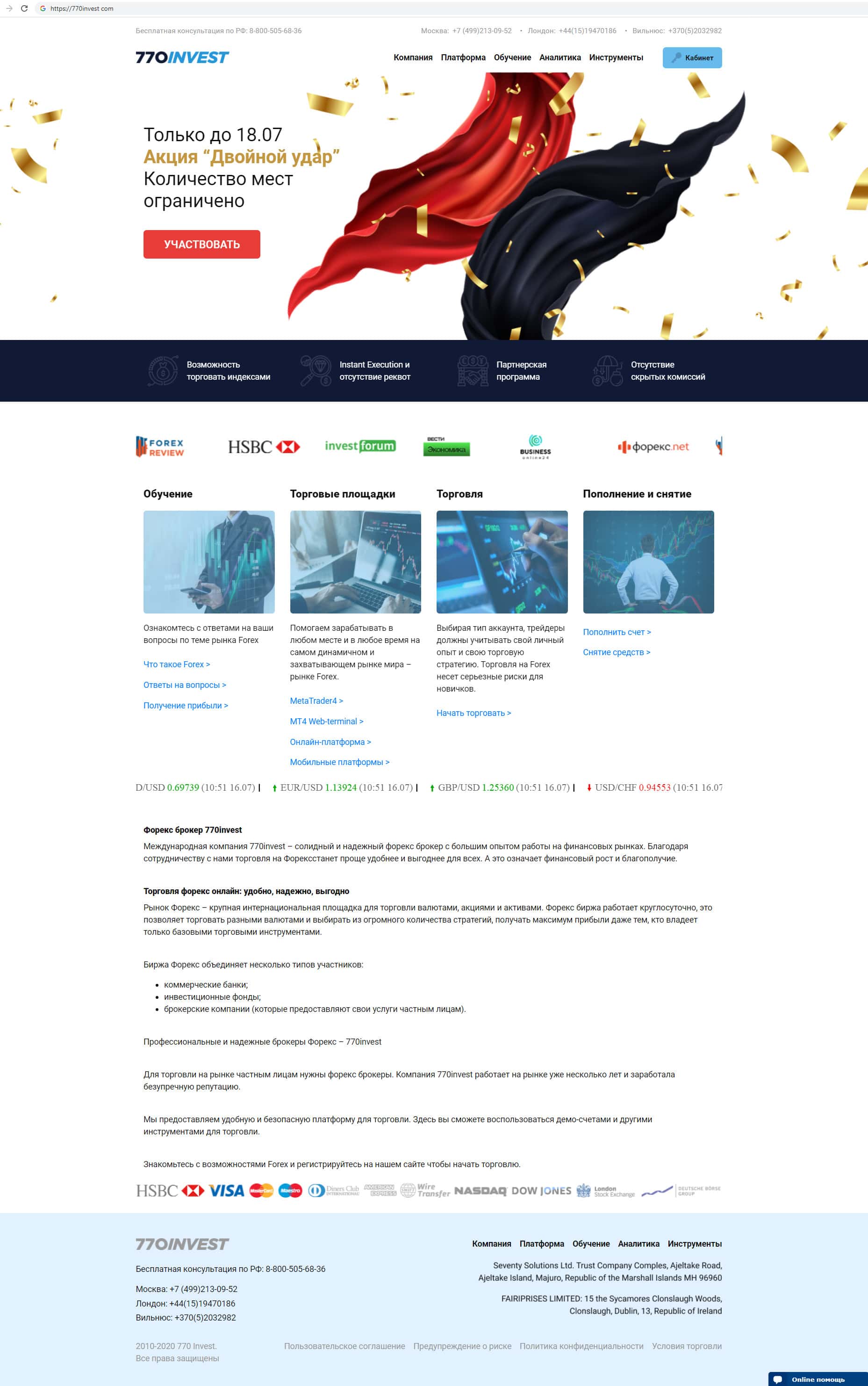 770Invest - очередная скам-организация, которая предлагает липовые услуги трейдинга на рынке Форекс, к которому на самом деле отношения не имеет. Данный интернет-лохотрон предоставляет информацию о фальшивом регуляторе на Маршалловых Островах, на сайтах которого нет возможности определить существование их регистрационного номера. Жулики работают с использованием платформы Мета Трейдер 4, которая разработана компанией MetaQuotes. Более того на контору 770 Инвест пришла прямая жалоба, которая подтверждает тот факт, что данный скам-брокер действует сообща с мошеннической конторой 770 Капитал, с которой 770Invest также находятся на одном IP-адресе. Не связывайтесь с лохотронщиками 770 Инвест !!!