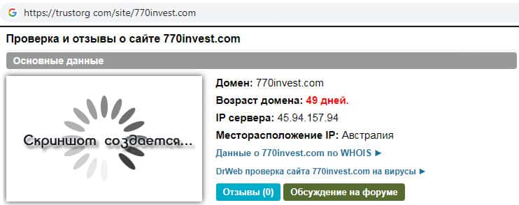 Проверка интернет-сервиса аферистов 770Invest на trustorg com показала, что возраст домена к моменту написания статьи составляет всего лишь 49 дней.