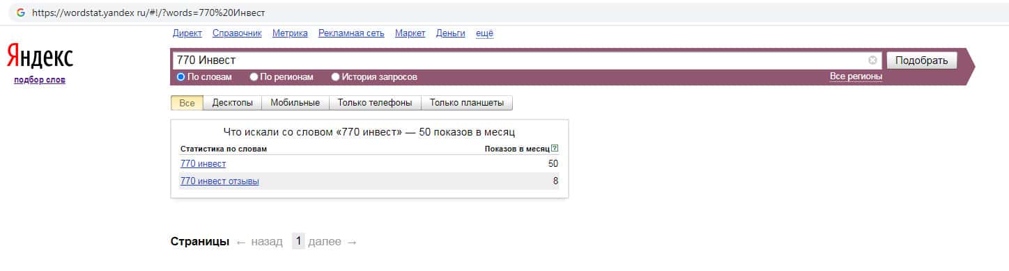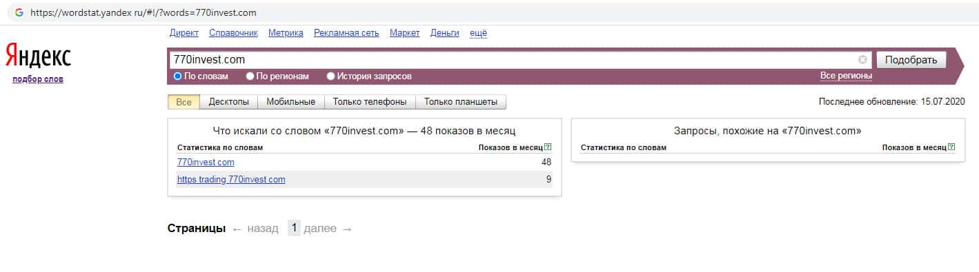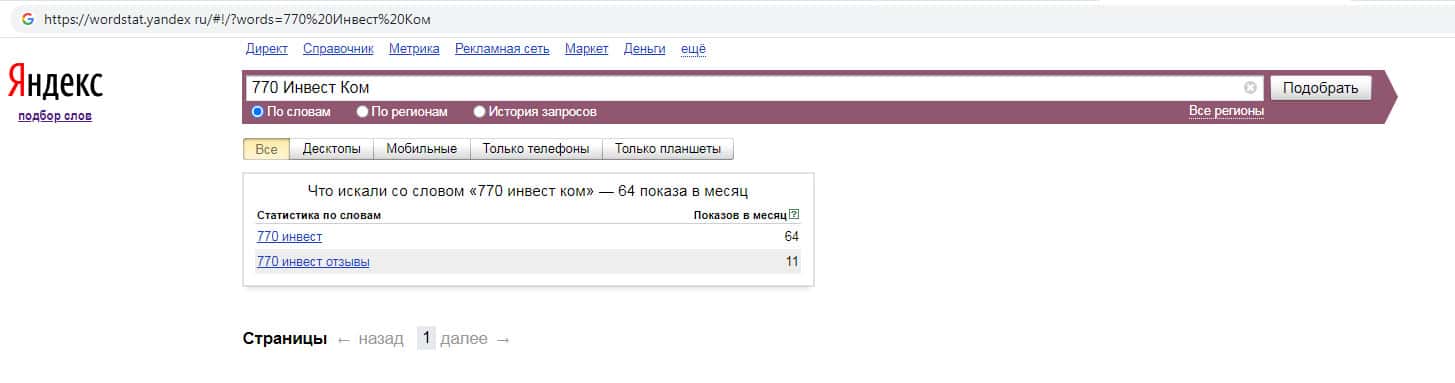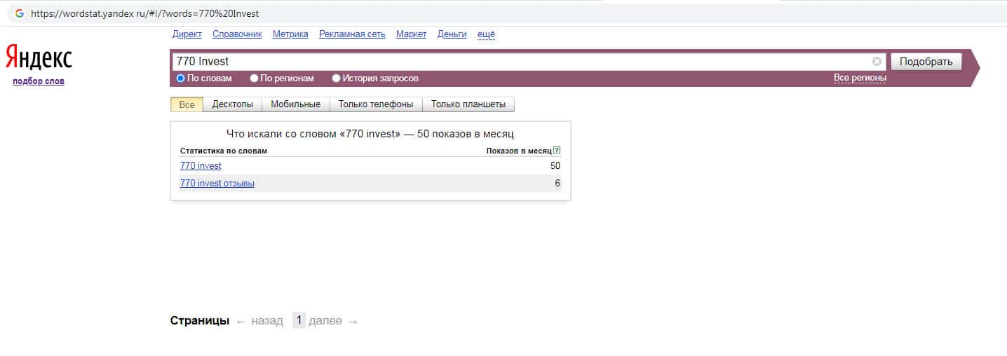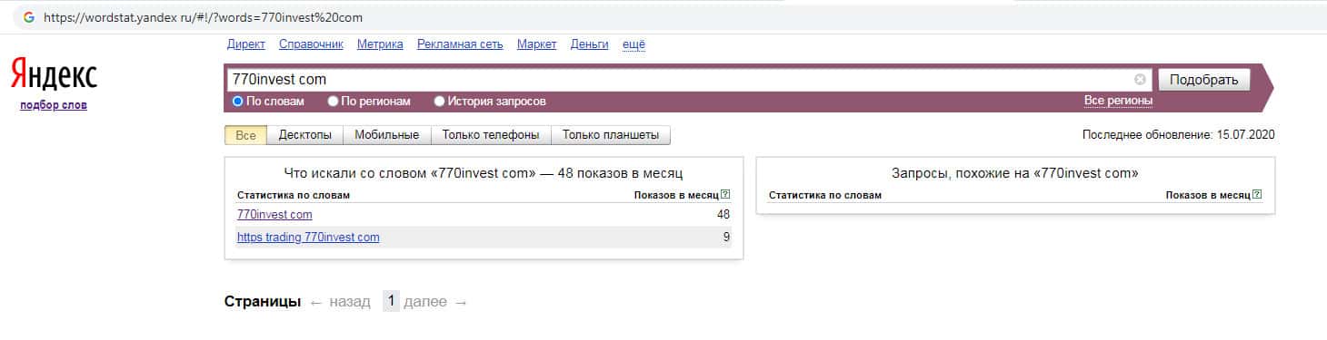 Данный бренд под названием "770invest.com" не пользуется особой популярностью на wordstat yandex ru, имея показатель 48 показов за месяц.