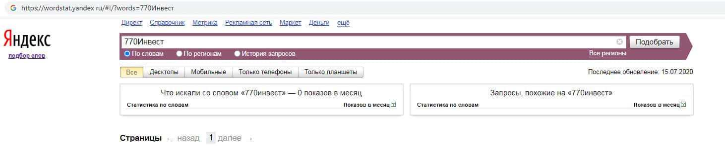 Количество запросов по бренду на русском языке без пробела "770Инвест" показало нулевой результат.